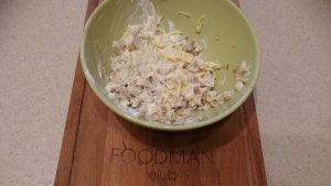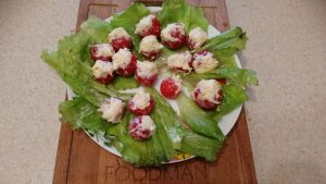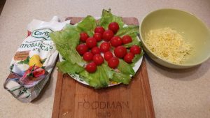 - Sur les feuilles de laitue, nous déposons immédiatement notre cerise. Fromage râpé mélangé avec mayonnaise, vous pouvez ajouter l’ail.