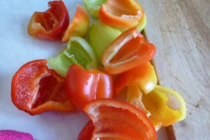 Hacher les champignons et les pailles fines de paprika, vert anneaux de proue.