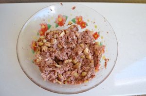 Dans le bol, nous envoyons la farce préparée, ajoutez la chair de l’aubergine, une pincée de fromage râpé, d’origan, de poivre, de sel, un œuf et bien mélanger.