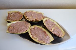 Aubergines parfumées servies avec vos salades préférées et fraîches les légumes. La viande hachée peut être éventuellement complétée avec des herbes et des épices à goûter.
