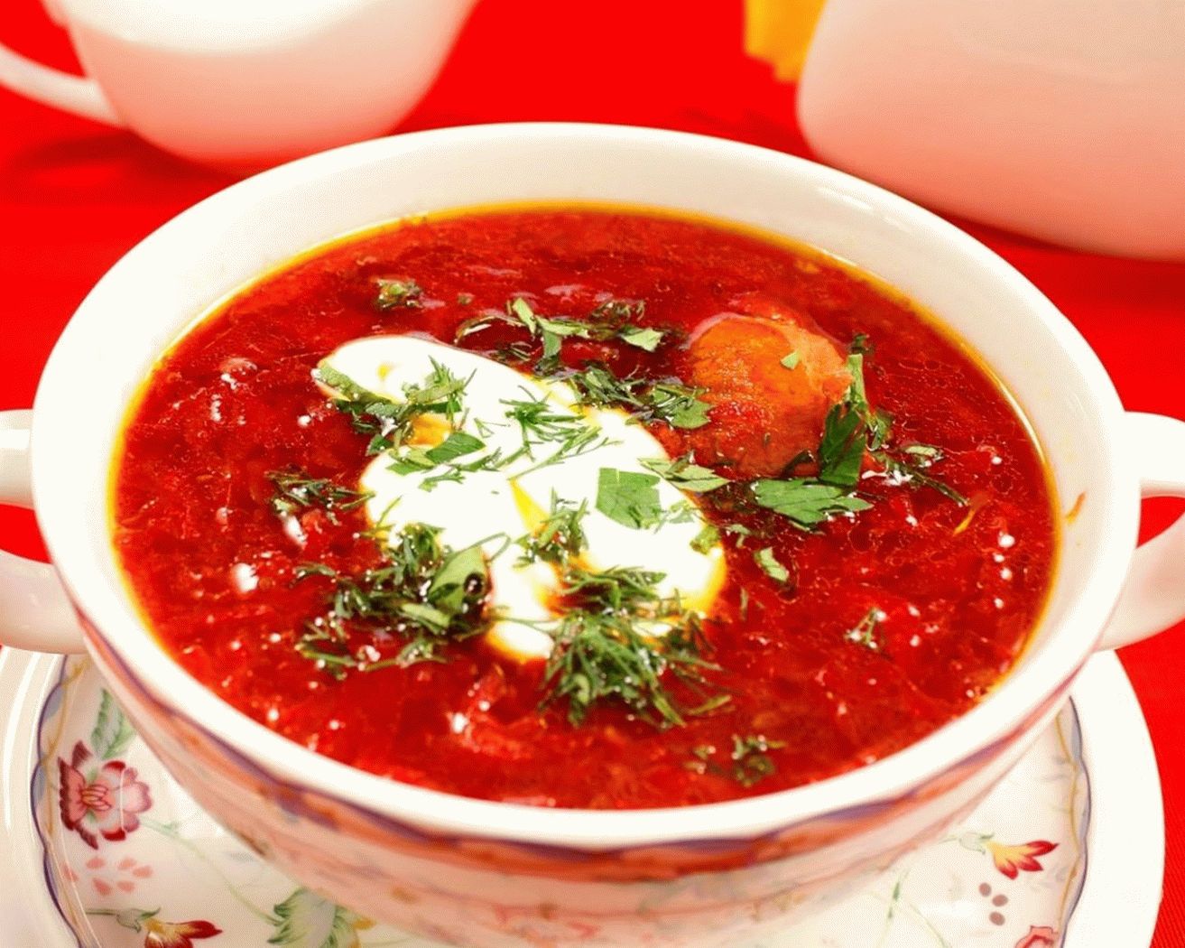 - 20 minutes avant la cuisson, ajoutez les légumes, mélangez, ajouter des verts et éteindre. Notre bortsch classique avec incroyable l’arôme et la couleur rouge riche est prêt. Profitez de votre l’appétit!