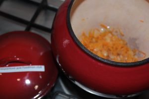 - Cuire la viande, comme d’habitude. Tout d’abord, faire frire finement haché oignons et carottes hachés finement sur une râpe.
