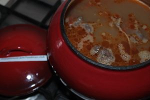 Frire pendant 10 minutes supplémentaires, puis ajoute de l’eau � viande recouverte de 3 doigts. Porter à ébullition, arrêter parapluie de laurier et aneth. Cuire encore 25 minutes.