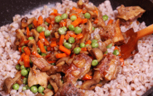 - Nous ajoutons des pois au dernier des légumes, et dans quelques minutes mélanger la viande et les légumes avec de l’orge bouillie. Retirer du feu et servir à la table.