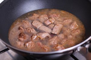 - Rincer le boeuf, couper en petits morceaux, faire frire jusqu’� blush sur l’huile végétale, verser dans l’eau et laisser mijoter pendant environ une heure.