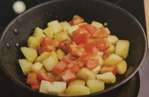 - Verser l’huile dans une poêle à feu moyen sur feu moyen. mettre les pommes de terre et les faire frire pendant 6 à 7 minutes, puis ajouter céleri et frire encore 3-4 minutes. Ajouter des tranches à la fin tomates et faire frire 3 à 4 minutes jusqu’à tendreté. Sel et poivre goûter