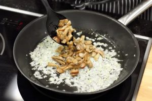 Pelez et coupez en dés l’ail, les oignons, les pommes de terre et champignons – avec des assiettes. Mettez la casserole sur le feu, versez l’huile végétale et y mélanger l’ail et les oignons, après quelques minutes de friture – ajoutez les champignons et les pommes de terre. Sel, poivre, verser un peu d’eau et laisser mijoter jusqu’à tendreté. En fin de cuisson ajoutez du romarin frais haché.