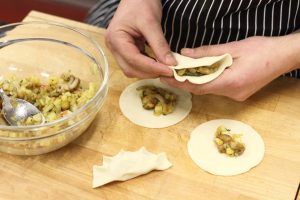 Prenez une partie de la pâte, faites-en une saucisse avec vos mains. Alors couper des morceaux d’environ 1,5 cm et les rouler de manière à ce que avéré même des cercles. Maintenant, vous devez mettre un petit quantité de remplissage et des boulettes de forme.