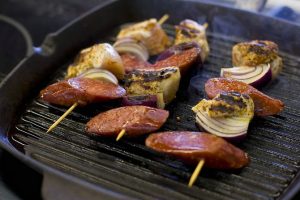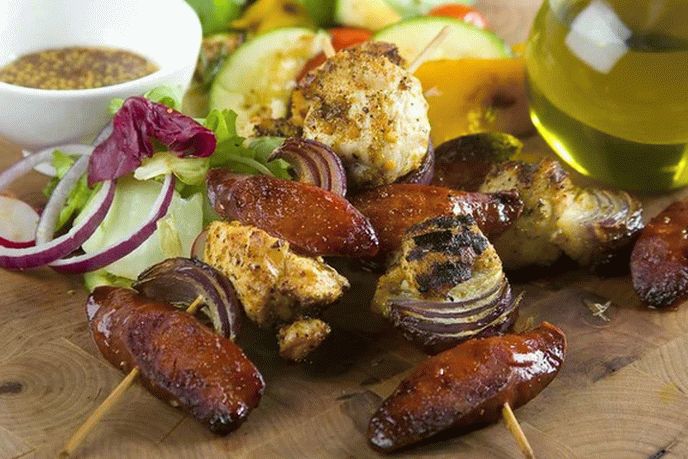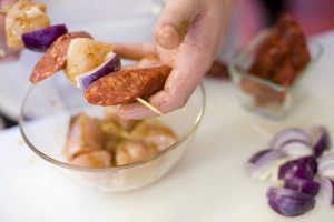 Enfiler la viande, les oignons et les saucisses sur des brochettes.