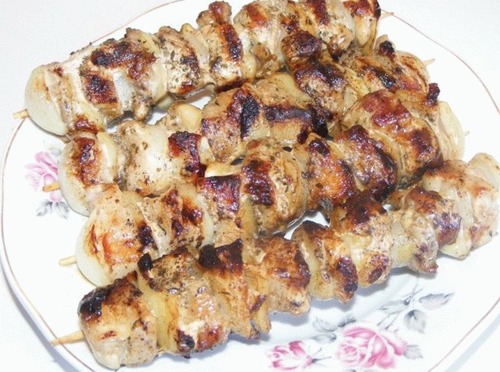 Des brochettes parfumées et délicieuses peuvent être préparées non seulement barbecue ou au four à la maison, mais aussi sur le gril. À la viande juteux, pré-mariner avec des oignons et poivron Un accompagnement est préférable de faire une salade de légumes frais.