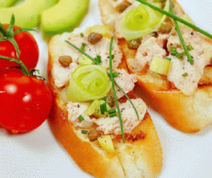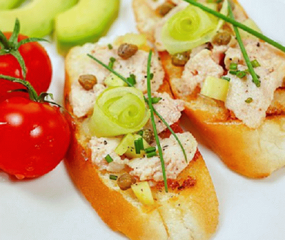 De belles et délicieuses bruschettas au foie de morue sont parfaits pour à votre table de vacances. Pour faire cet apéritif faire frire les tranches de baguette dans de l’huile d’olive et mettre tous les ingrédients sur le dessus.