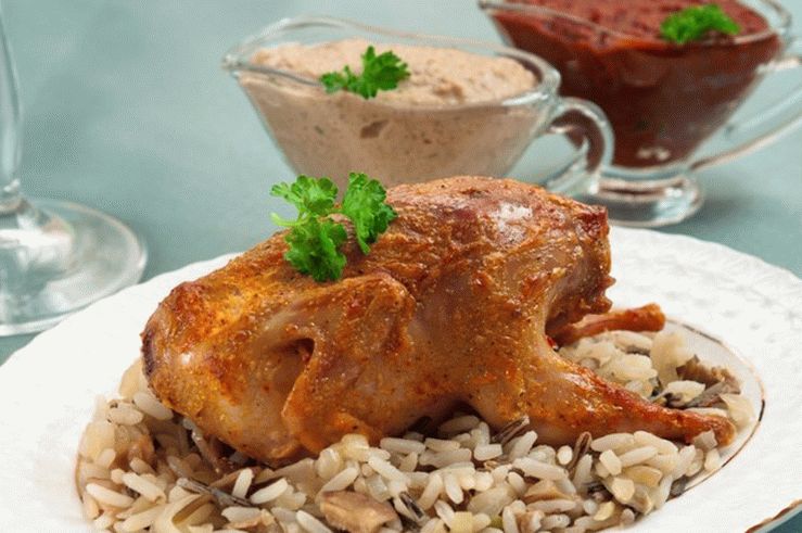 Repas gastronomique festif. Caille farcie au riz et Les cèpes sont très savoureux et tendres. Cuit à la maison, la sauce aux champignons complétera le plat.