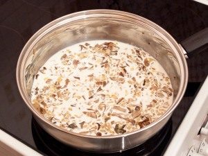 - Pour la sauce aux champignons à la moitié restante des champignons ilyuku ajouter la crème, porter à ébullition.