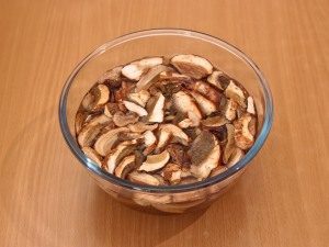 - Porcini champignons, verser de l’eau chaude et laisser une demi-heure, puis hachez.