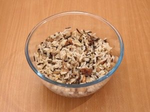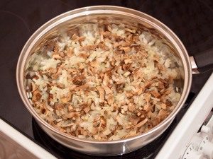 - Dans un bol, mélanger la moitié des champignons avec l’oignon (la seconde moitié laisser en sauce) et du riz précuit.