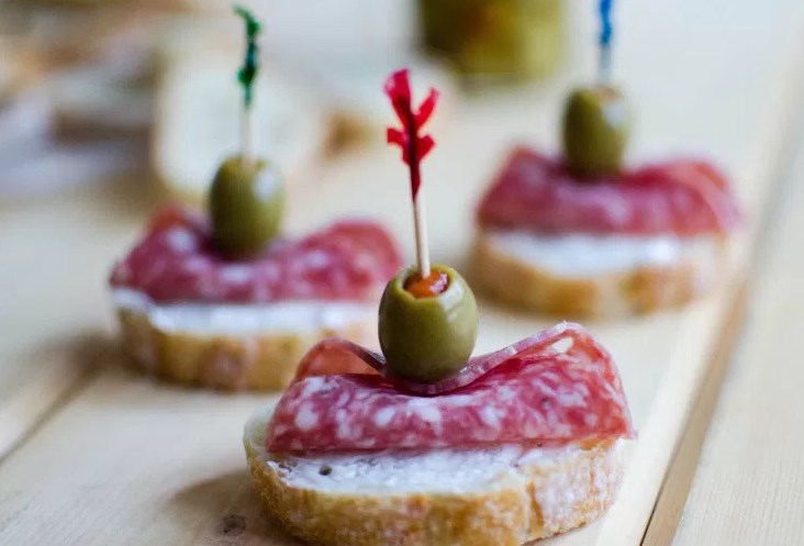 Une belle collation de fête faite de baguette, de fines tranches de salami, les olives et le fromage à la crème deviendront une décoration de table. Si délicieux les canapés peuvent toujours être cuisinés à la maison avec du jambon ou à la chasse saucisses.