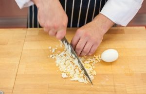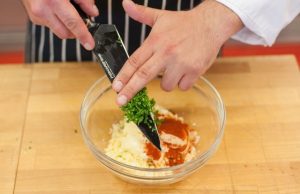 Faire bouillir les œufs pendant 9 à 10 minutes, les peler et les hacher finement avec un couteau.