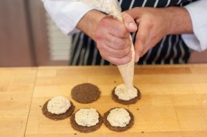 Nous déposons le mélange d’œufs dans un sac à pâtisserie. De tranches pain de seigle découpe un emporte-pièce en petits cercles (10 pcs.) et presser le mélange d’oeufs sur eux.