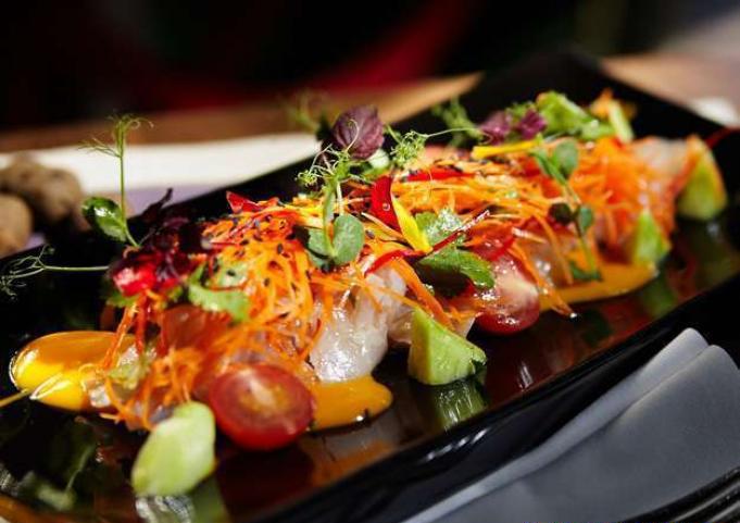 Mettre le poisson mariné sur le dessus, mettre sur les bords de l’assiette concombres et cerises. Saupoudrer le plat de carottes, de piments rouges et de graines de sésame. Vous pouvez également ajouter des greens.
