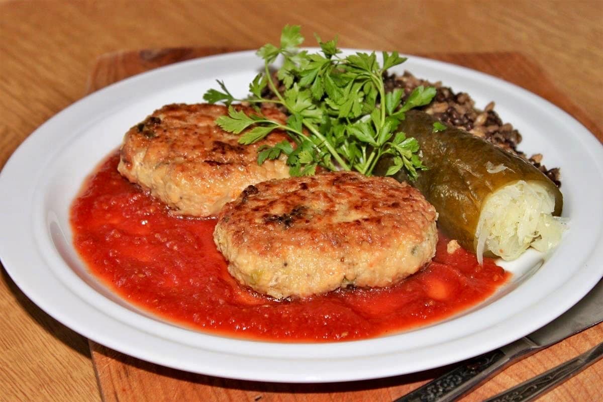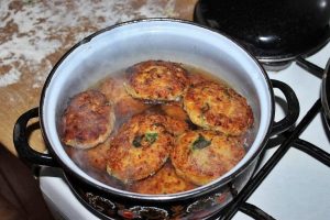 Éplucher les carottes et le persil, les râper finement, hacher l’oignon hacher finement l’ail à travers une presse. Tous les légumes préparés envoyer à la viande de porc hachée.