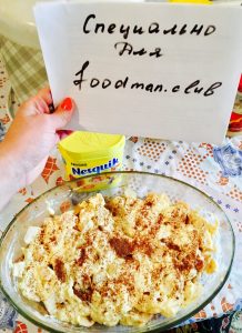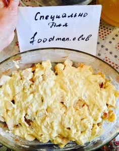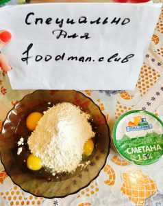 - Pendant ce temps, préparez la pâte, mélangez les œufs, le sucre et le saler, puis ajouter la farine, la poudre à pâte et la crème sure.