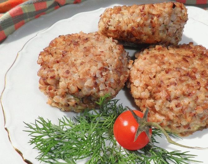 Boulettes de viande faites maison avec du poulet haché aux champignons et le sarrasin est une combinaison intéressante et un goût parfait complété avec des légumes.