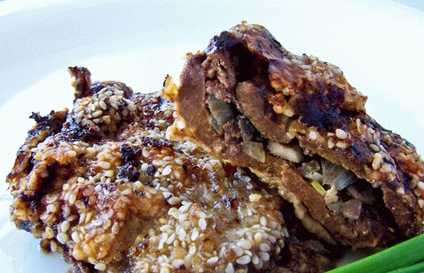 Des boulettes de viande insolites et savoureuses cuisent à la maison avec du foie farci de champignons et de noix dans une chapelure au sésame.