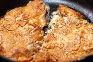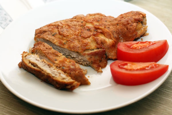Frire à feu moyen des deux côtés pendant 3-4 minutes jusqu’à ce que la croûte brune et servir chaud avec la salade de pommes de terre, assaisonné de mayonnaise et de légumes frais (tomates, concombres).