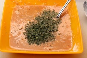 Verser la sauce soja dans un bol, ajouter les oeufs, la farine et bien mélanger.