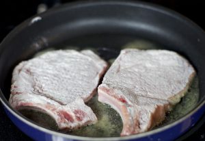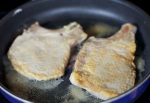 Rouler les côtelettes dans la farine et les répartir par portions. dans de l’huile chaude et faire frire à feu vif pendant 2 minutes, jusqu’à ce que recouvert d’une croûte dorée.
