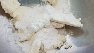 - Battre le fromage avec du sucre en poudre avec mélangeur.