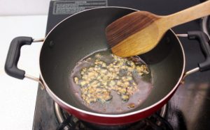 - Dans l’huile chauffée, versez l’ail et les épices.