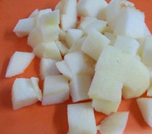 - Lavez les pommes, épluchez-les, retirez-les, coupez-les. Nous le répandons.