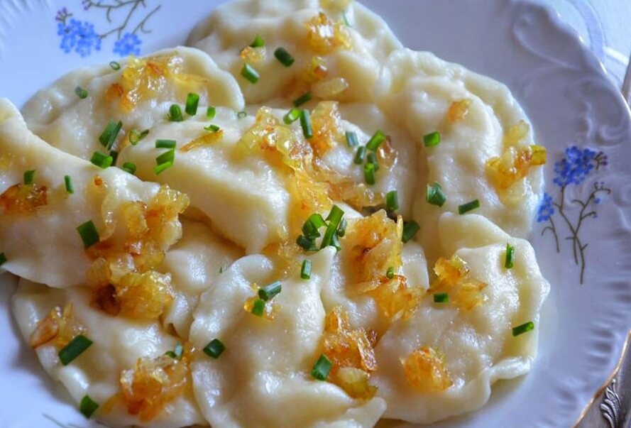- Dumplings farcis de pommes de terre et de fromage servis à table chaud, versez dessus avec de l’huile de crème, saupoudrez le reste des oignons frits et hachés oignons verts.