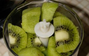 - Épluchez le kiwi, mettez-le dans un mélangeur, ajoutez 2 c. l miel et 50 ml yaourt Battre jusqu’à consistance lisse et verser dans des verres.