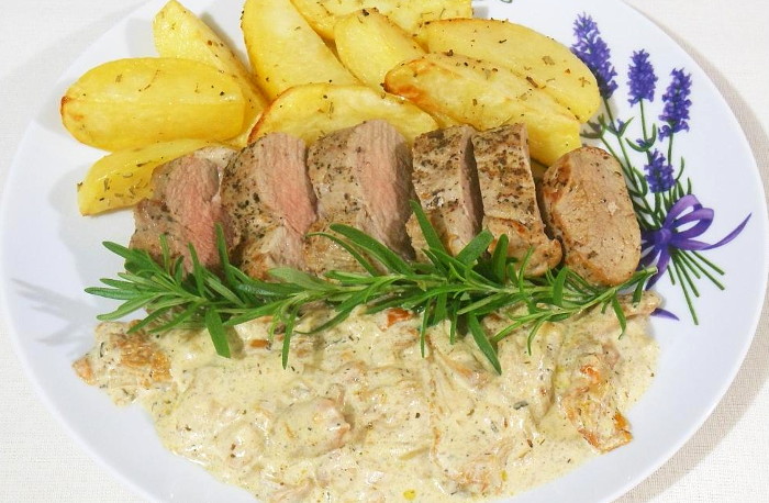 Le filet de porc deviendra incroyablement délicieux et parfumé s’il cuisiner à la maison avec les chanterelles. Nous sortons la viande finie de la casserole et ajouter la crème aux champignons et faire la sauce à la viande. Pomme de terre de manière rustique sera le plat d’accompagnement parfait pour un tel plat.