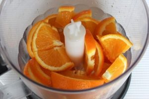 Lavez les oranges, coupez les en 4 parties. Enlever les os et broyer avec le zeste dans un mélangeur.