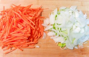 - Laver les oignons, les carottes, les peaux et les couper en lanières.