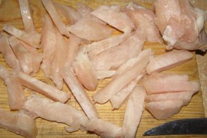 - Mon filet de poulet, sécher avec une serviette en papier et coupé en pièces longitudinales gracieuses.