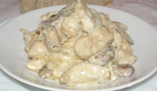 - Dès que la viande devient blanche, versez la crème, endormez les champignons et noix de muscade. Saler et poivrer au goût.