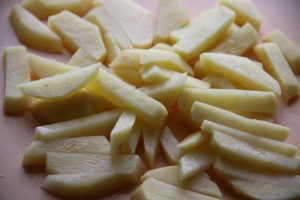 Éplucher et laver les pommes de terre. Couper en lanières et enfiler serviettes en papier. Éponger les tranches à fond. Ils devraient être sécher de manière à ce que, après la cuisson, la structure soit obtenue autant que possible tendre.