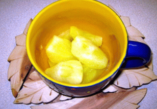 - Maintenant, dans le micro-ondes, nous faisons cuire des pommes. Pour ces pièces pliez la pomme pelée dans un récipient approprié et placez-la dans micro-ondes pendant 4 minutes.