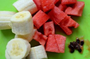 - Épluchez et hachez les fruits et la pastèque. Nous extrayons tout de la pastèque les os.