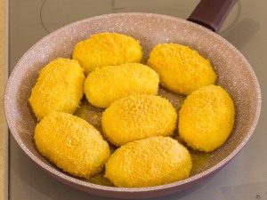 - Mouiller les mains pour former une côtelette oblongue, tremper elle dans un œuf battu, puis dans une panure.