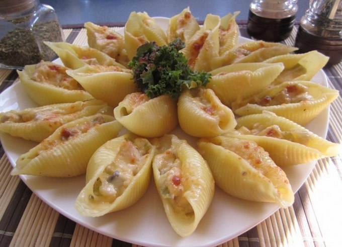 Ajoutez le remplissage aux coquilles, mettez-les dans une casserole et versez l’eau pour qu’elle ne cache pas complètement les pâtes.