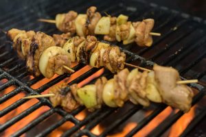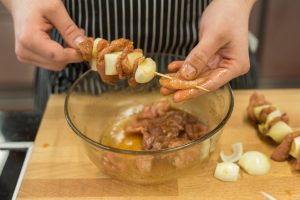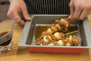 - Après le temps imparti pour la préparation du poulet et des oignons, sur des brochettes en bois.