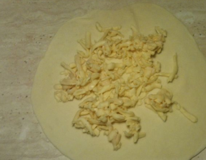 - Pour le khachapuri, nous prenons deux gâteaux. Saupoudrer un avec du fromage râpé, et couvrir la seconde d’en haut. Pincez les bords du gâteau. Alors fais avec chacun