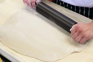 Abaisser la pâte pour khinkali en une fine couche et la découper avec un verre cercles d’un diamètre de 10 cm.