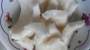 - Nous nettoyons la chair blanche de la noix de coco de la peau brune. Puis du lait et les frites sont blanches.