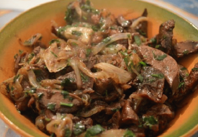 - Faire chauffer le gras dans une grande poêle, faire frire les abats et les morceaux lapin.